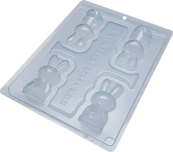 Manufactured by BWB, the three-part system ensures accurate alignment, consistent shell thickness, and reliable release when used with tempered chocolate. The compact bunny size is well suited for high-volume production, mixed assortments, and retail-ready packaging.